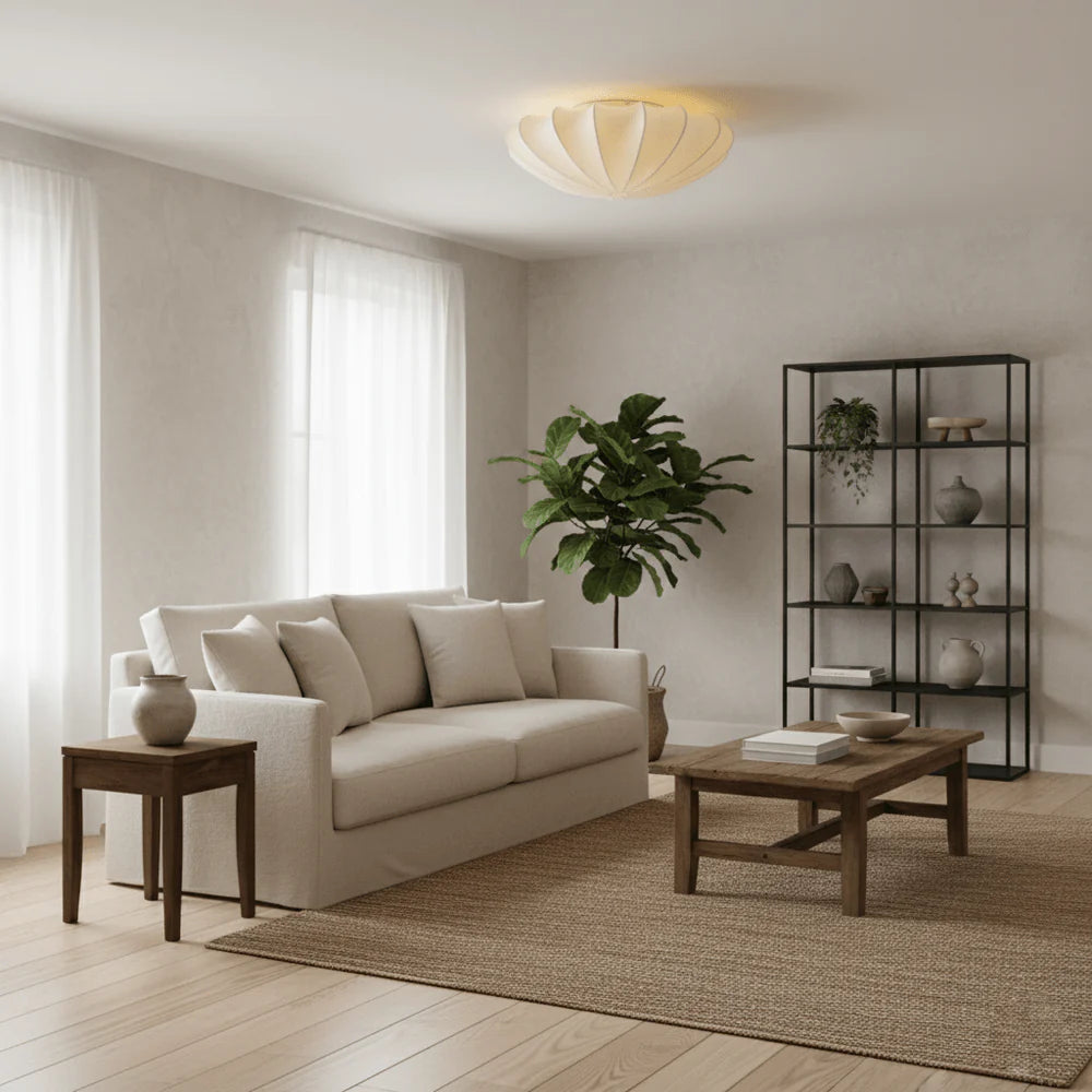 The Selfon Ceiling Light features a graceful shell-inspired design that brings soft elegance to modern interiors. Crafted with a delicate silk shade and metal frame, this stylish ceiling light diffuses light beautifully to create warm and comfortable ambient ceiling lighting. Its sculptural form makes it a striking modern ceiling lamp for bedrooms, living rooms, dining areas, and hallways. The layered shell shape adds visual depth while maintaining a light and airy aesthetic. Compatible with LED or Edison bulbs, the Selfon Ceiling Light provides balanced illumination while adding a decorative focal point to contemporary indoor spaces.